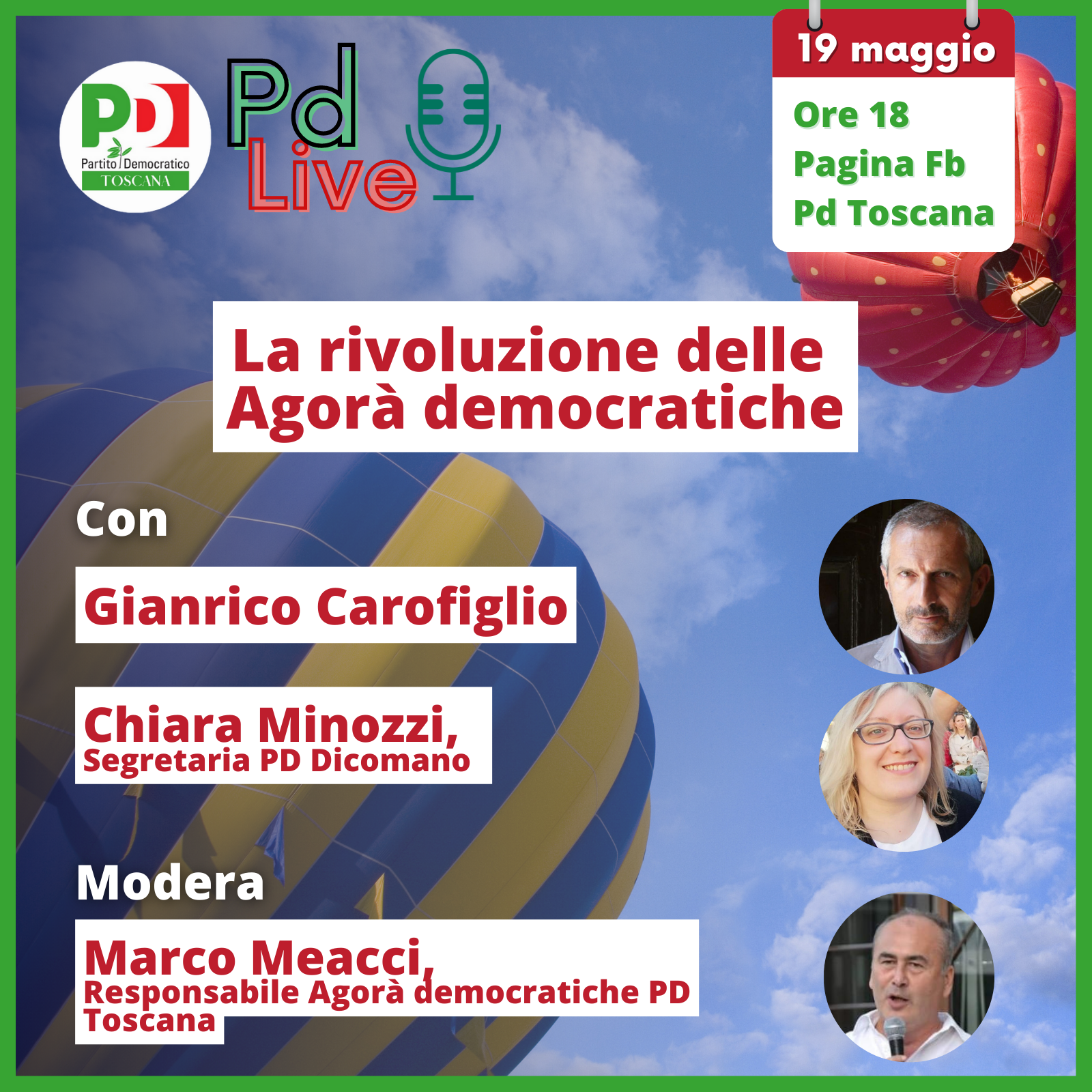 Parleremo di Agorà democratiche con Gianrico Carofiglio e Chiara Minozzi, segretaria del PD di Dicomano. Modererà Marco Meacci, responsabile delle agorà democratiche del PD Toscana