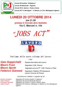 I Circoli PD Isolotto “E.Balducci”, Circolo PD Monticelli – Pignone, Circolo PD S. Quirico – Ponte a Greve, Circolo PD “E. Berlinguer”, S. Bartolo, Le Torri, Mantignano Ugnano di Firenze organizzano per LUNEDI 20 OTTOBRE alle ore 21.00 presso il Circolo Arci Isolotto in Via C. Maccari n. 104 incontro dal titolo “JOBS ACT”.