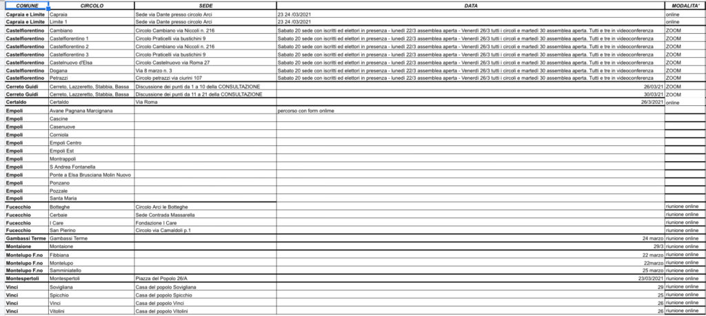 COMUNE CIRCOLO SEDE DATA MODALITA’ COLLESALVETTI UNIONE COMUNALE COLLESALVETTI 03/22/2021 0nline COLLESALVETTI Vicarello-Guasticce-Stagno VICARELLO-GUASTICCE-STAGNO 03/24/2021 0nline (1°incontro) COLLESALVETTI Collesalvetti-Nugola-Colognole COLLESALVETTI-NUGOLA-COLOGNOLE 03/25/2021 0nline COLLESALVETTI Vicarello-Guasticce-Stagno VICARELLO-GUASTICCE-STAGNO 03/29/2021 0nline (2°incontro) Cecina Unione Comunale via Croce 39 03/24/2021 online Rosignano Marittimo Rosignano Costa piazza del Risorgimento 24 Rosignano Solvay 23/3 in presenza (1° inc. h 17-19) Rosignano Marittimo Rosignano Costa piazza del Risorgimento 24 Rosignano Solvay 25/3 in presenza (2° inc. h 17-19) Rosignano Marittimo Rosignano Costa piazza del Risorgimento 24 Rosignano Solvay 24/3 online (1° inc. h 18-19.30/21.15-23) Rosignano Marittimo Rosignano Costa piazza del Risorgimento 24 Rosignano Solvay 25/3 online (2°inc. H 18-19,30/21.15-23) Livorno Ardenza La Rosa Circolo Ardenza La Rosa 20/3 in presenza Livorno San Jacopo via San Jacopo in Acquaviva 22/3 online (1° incontro) 25/3 online ( 2° incontro) Livorno Borgo Fabbricotti piazza Giovine Italia 24/3 online Livorno Borgo Fabbricotti-Centro piazza Giovine Italia 30/3 online Livorno Livorno Sud-Venezia-XXV Aprile 25/3 online San Marco Pontino-Colline CotetoEconomia Marittima-Sanità Componentistica Livorno Salviano-La Leccia Via di Salviano 03/25/21 online Livorno Collinaia-Scopaia Circolo Collinaia-Scopaia 20 marzo presenza Rosignano Marittimo Castelnuovo-Gabbro- Rosignano Marittimo Rosignano Marittimo Bibbona BIBBONA LA CALIFORNIA 03/29/21 online