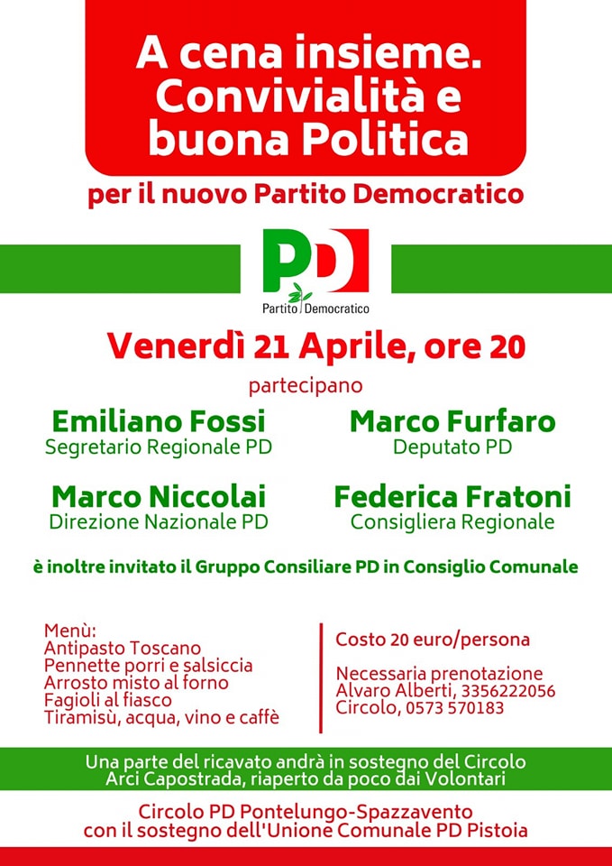 A cena insieme. Convivialità e Buona politica per il nuovo Partito Democratico: è questo il titolo della cena organizzata al Circolo PD Pontelungo-Spazzavento, con il sostegno dell’Unione Comunale PD Pistoia.
