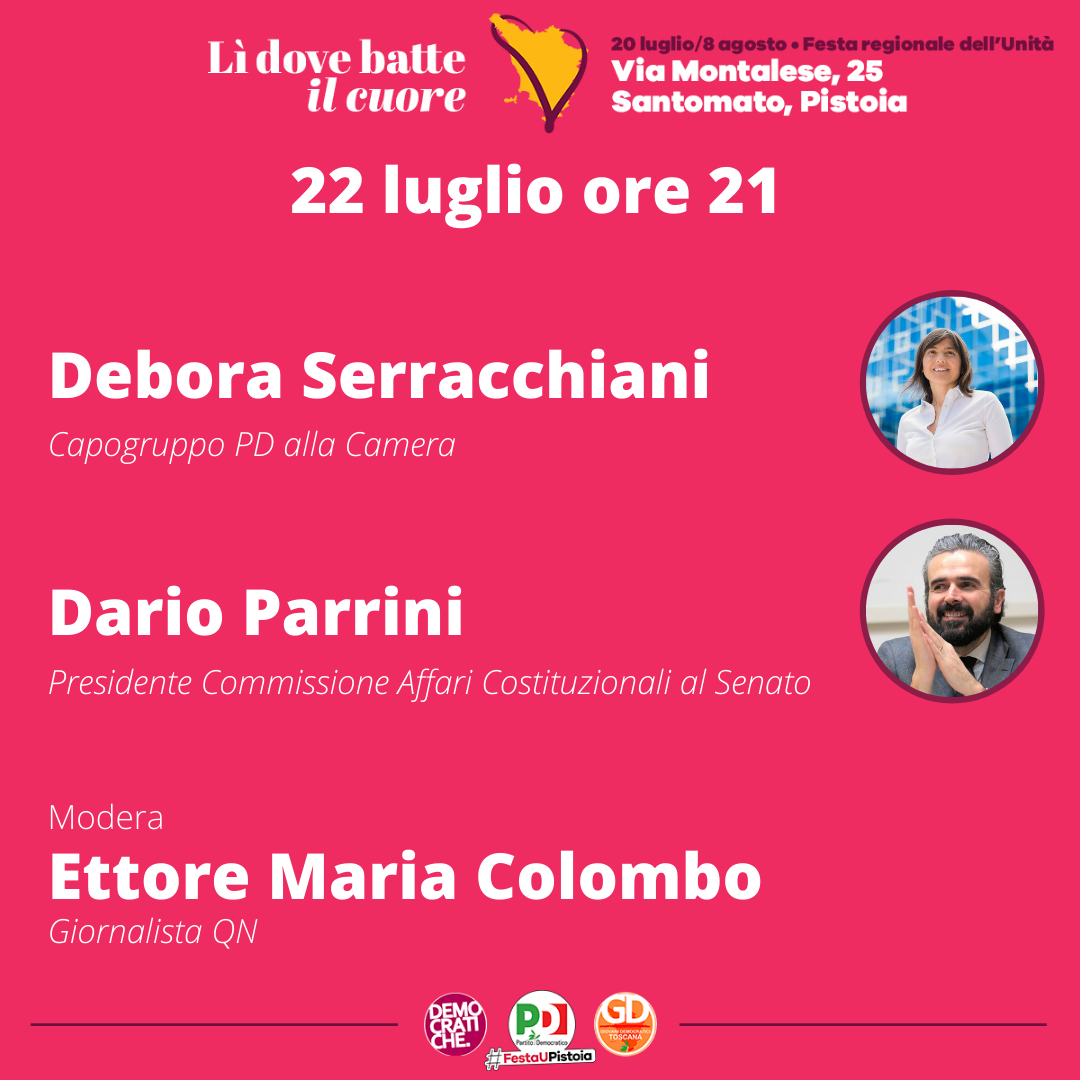 Domani la capogruppo Pd alla Camera, Debora Serracchiani, e il Presidente della Commissione Affari Costituzionali del Senato Dario Parrini, saranno intervistati da Ettore Maria Colombo, giornalista di QN.