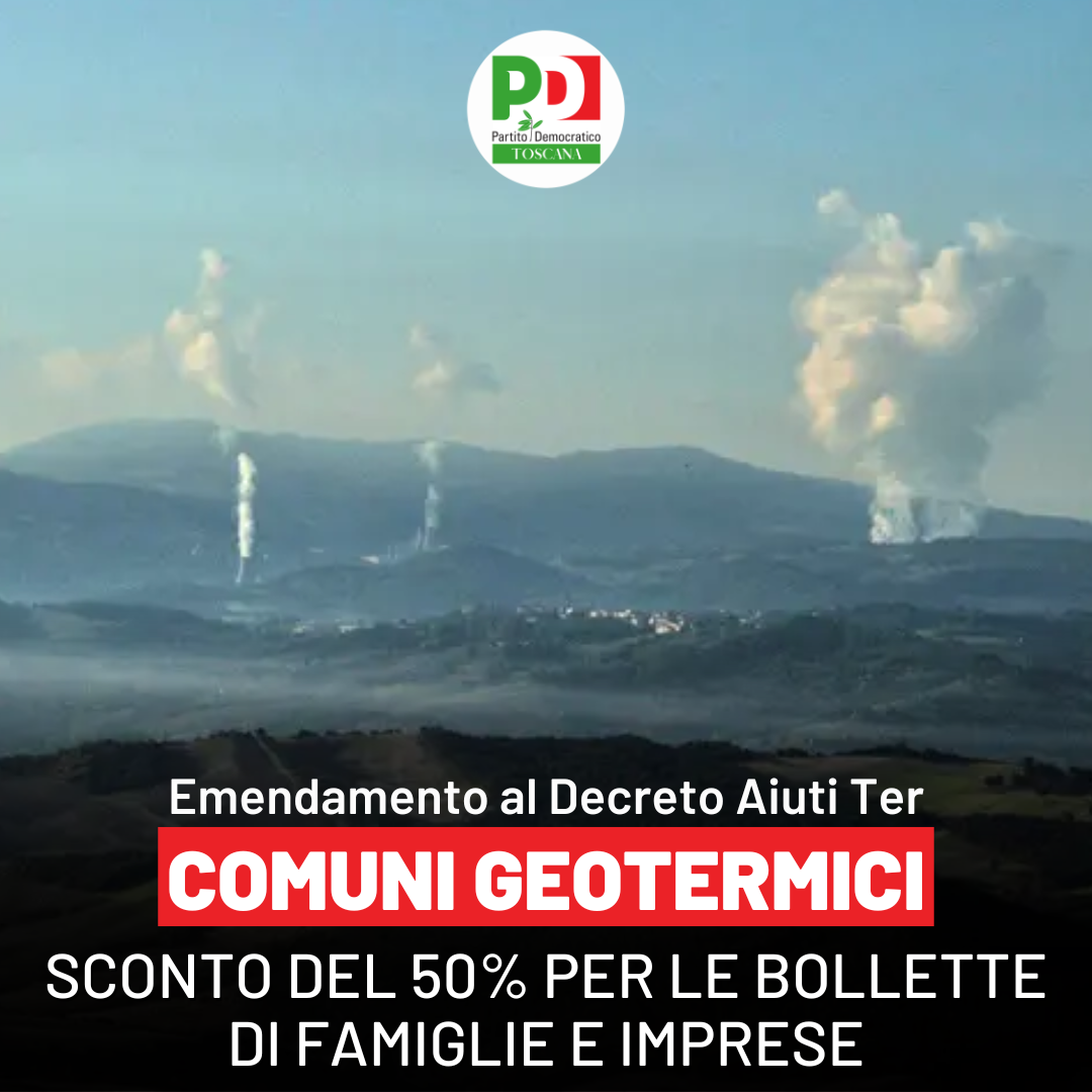 “Sconto del 50 per cento per le bollette di famiglie ed imprese dei comuni geotermici”: è quanto chiede un emendamento del Pd al Decreto Aiuti Ter, sottoscritto dai deputati eletti in Toscana del Pd Marco Simiani, Simona Bonafè, Laura Boldrini, Emiliano Fossi, Federico Gianassi e Christian Di Sanzo. Il provvedimento verrà sostenuto a Palazzo Madama dai senatori toscani del Partito Democratico Dario Parrini, Ylenia Zambito e Silvio Franceschelli.