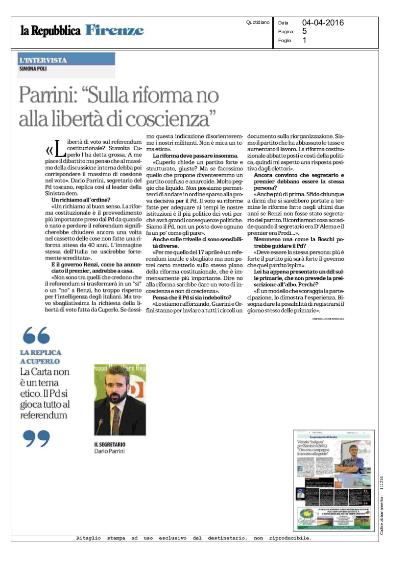 “Sulla riforma costituzionale no alla libertà di coscienza”. Intervista a Dario Parrini su “Repubblica Firenze”