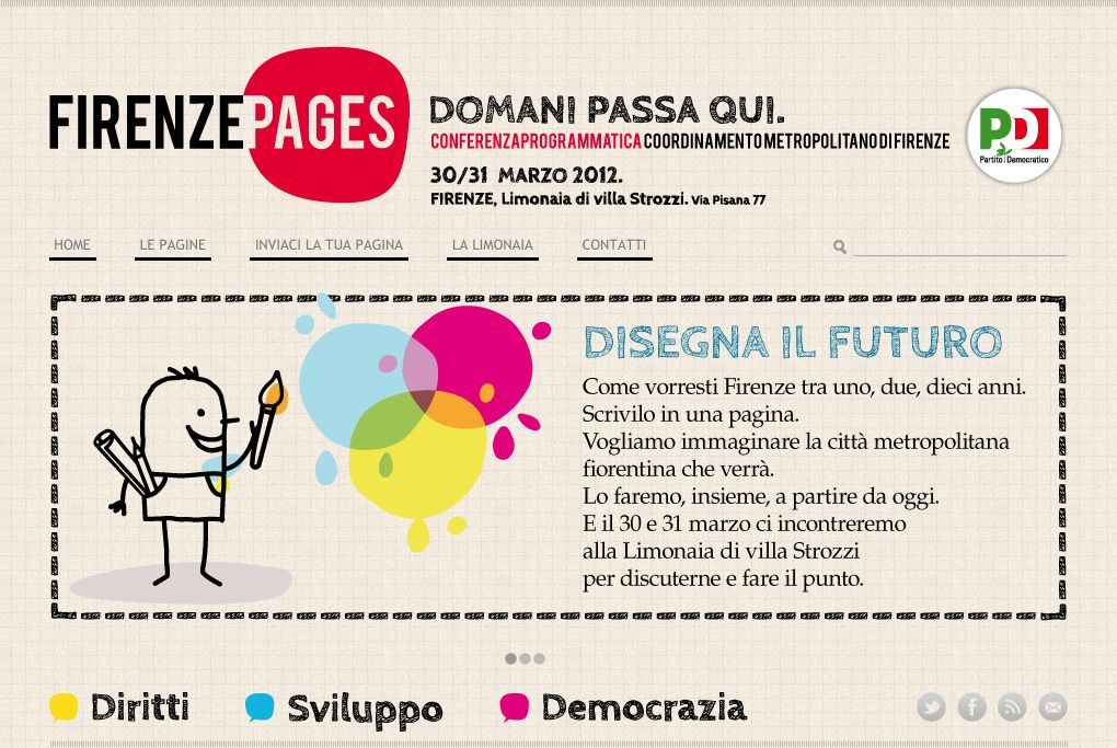 Domani venerdì 30 marzo, alla Limonaia di Villa Strozzi, alle 20 aprirà i lavori Serena Pillozzi, membro della segreteria e responsabile di FirenzePages. Alle 21 la prima sessione di dibattiti, sul tema dei Diritti con le relative sottotematiche Ambiente, Felicità, Relazioni, Uguaglianza, Welfare, introdotta da Massimo D’Antoni, docente Scienza delle Finanze presso la Università di Siena mentre dalle 21.30, spazio per gli interventi da FirenzePages, coordinati da Diana Kapo, segretaria Giovani Democratici Firenze, ognuno di 5 minuti circa; esporranno il loro contributo sia coloro che già lo hanno pubblicato sul sito, sia coloro che la sera stessa decideranno di lasciare il proprio, nel corner dedicato alla raccolta.