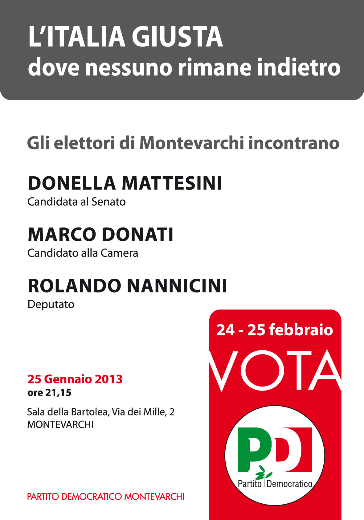 Alle 21.30, iniziativa elettorale a Montevarchi “L’Italia giusta, dove nessuno rimane indietro”. Appuntamento alla Sala della Bartolea (via dei Mille, 2) con i candidati alla Camera Donatella Mattesini e Marco Donati e il deputato Rolando Nannicini.