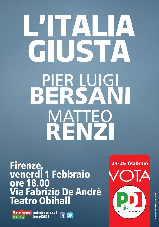 In provincia di Firenze Elisa Simoni e Dario Nardella parteciperanno alla cena di apertura della campagna elettorale organizzata dal Pd Mugello, al centro polivalente di Sant’Agata – Scarperia. La serata inizierà alle 20 e costerà 15 euro per gli adulti, mentre sarà gratis per i bambini. In città, al circolo Andrea del Sarto alle 21, Tea Albini e Filippo Fossati parteciperanno all’incontro “Welfare stretto fra bisogni e diritti: quali scelte operare?”. Domani alle 13 alla sede del PD Toscana in via Forlanini presentazione dell’iniziativa del 1° febbraio a Firenze con Pierluigi Bersani e Matteo Renzi. Intervengono Andrea Manciulli, segretario Pd Toscana; Patrizio Mecacci, segretario metropolitano Pd Firenze e Lorenza Giani, segretario comunale del Pd di Firenze.