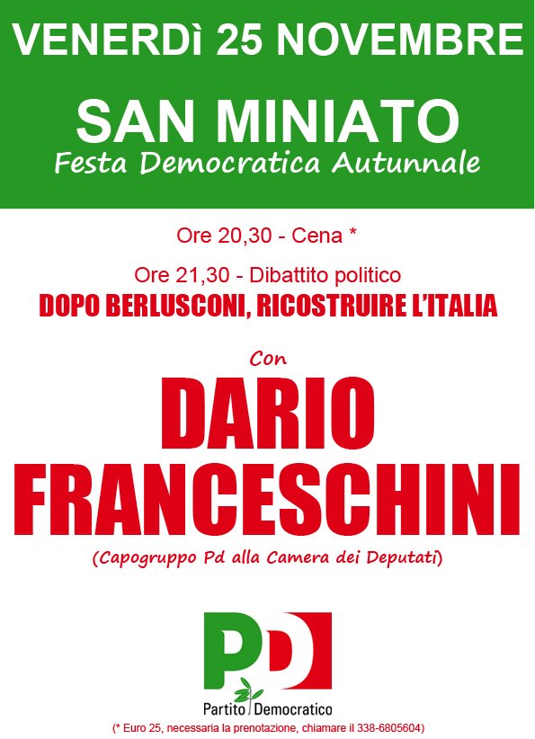 Venerdì 25 novembre, alla Festa Democratica autunnale di San Miniato (Pisa), ospite d’onore sarà Dario Franceschini.