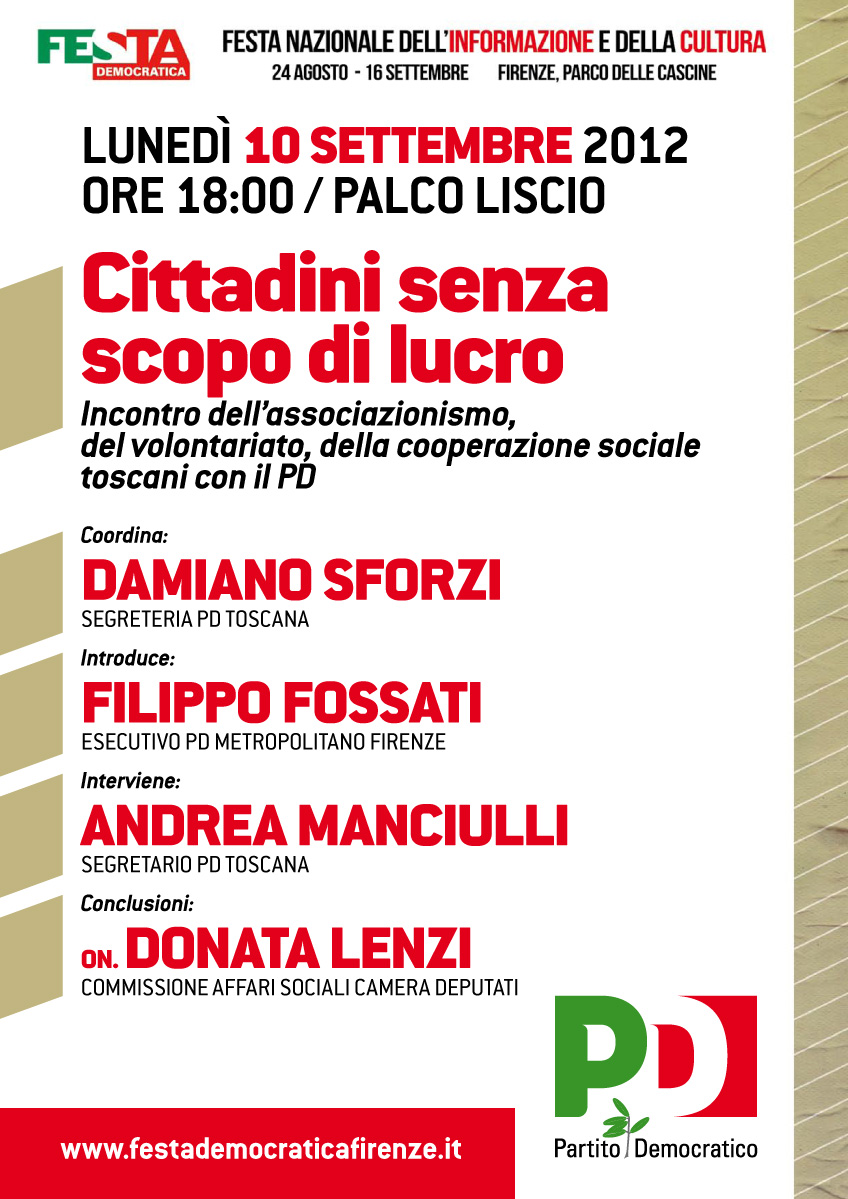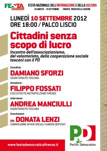 Alla Festa Democratica in corso alle Cascine a Firenze lunedì 10 settembre alle 18 al palco liscio tavola rotonda dal titolo “Cittadini senza scopo di lucro“.