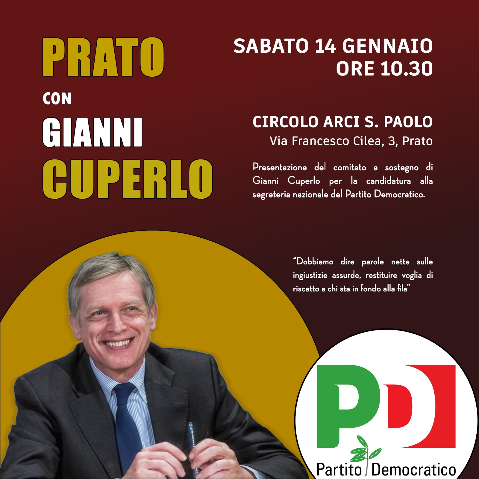 Sabato 14 gennaio alle 10:30 presentazione del comitato a sostegno di Gianni Cuperlo per la candidatura alla segreteria nazionale del Partito Democratico. Appuntamento al Circolo Arci S. Paolo, in via Francesco Cilea 3, a Prato.