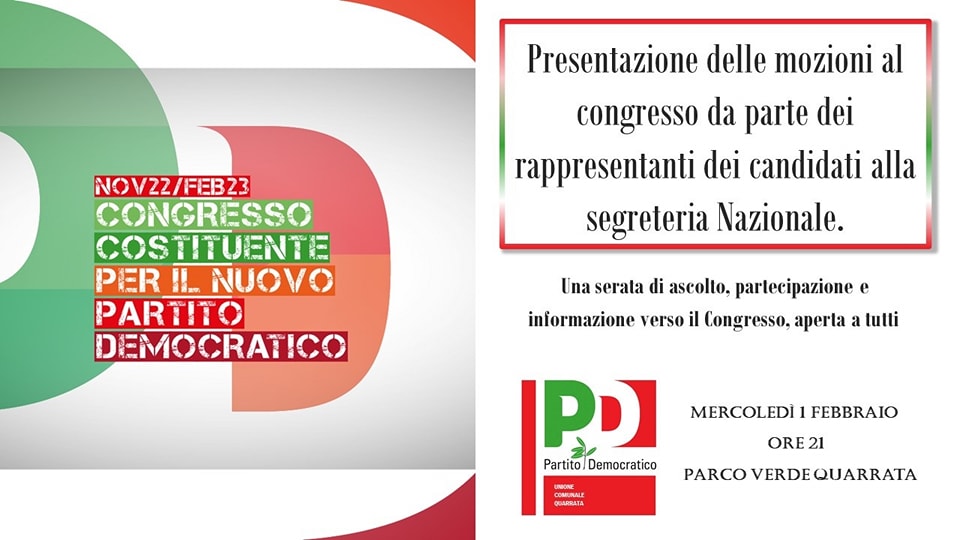 Si avvicina la fase conclusiva del congresso del PD. Alle 21 di mercoledì 1° febbraio, appuntamento a Quarrata con il confronto tra i rappresentanti dei candidati.