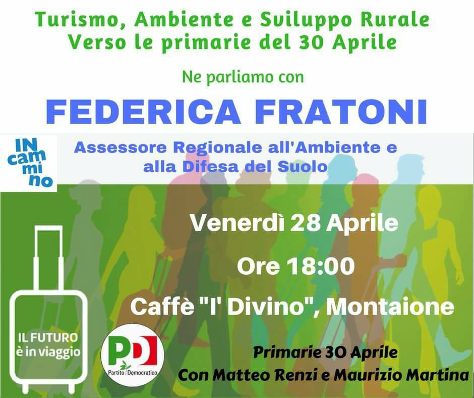 venerdì 28 aprile, alle 18.00 un incontro a Montaione, presso il caffè Divino il piazza Cavour, con l’assessore regionale all’ambiente e alla difesa del suolo Federica Fratoni. Tema della serata “Turismo, ambiente e sviluppo delle aree rurali. Verso le primarie del 30 aprile”.