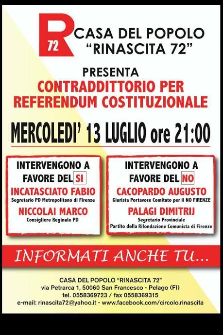 Per le ragioni del Si’ interverrà Riccardo Nocentini, della segreteria regionale Pd, in sostituzione di Fabio Incatasciato.
