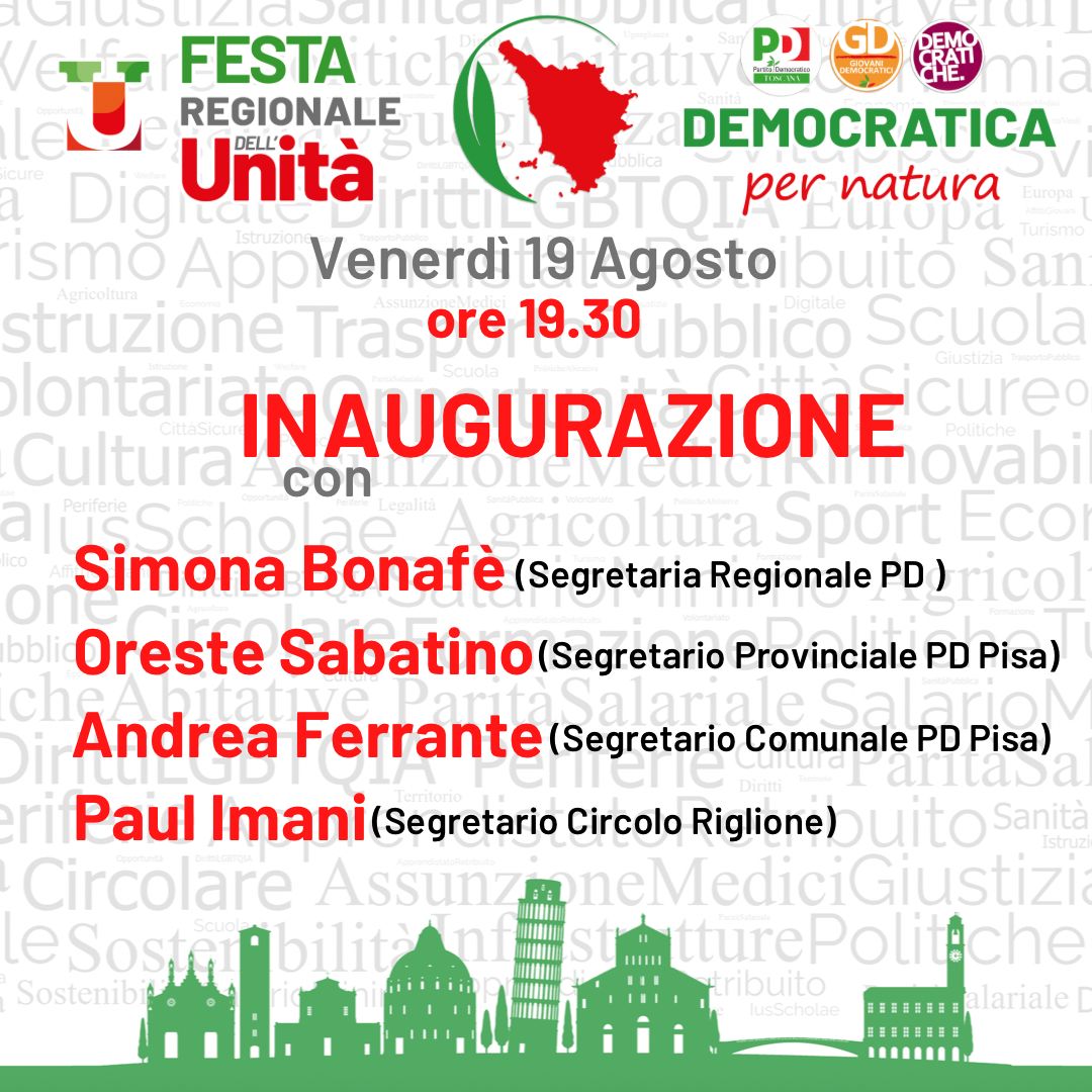 Taglio del nastro domani, venerdì 19 agosto, alle 19.30 con Simona Bonafè, Oreste Sabatino, Andrea Ferrante e il segretario del circolo Pd di Riglione Paul Imani. Il programma é ancora in via di ultimazione, ma vede come primo dibattito in calendario domani, 19 agosto, alle 21.30, un incontro sulla trasformazione digitale dell’impresa con la sottosegretaria Anna Ascani e l’assessore regionale Stefano Ciuoffo con Benedetta Squittieri, della segreteria regionale PD e il sindaco di Castelfranco di sotto Gabriele Toti.