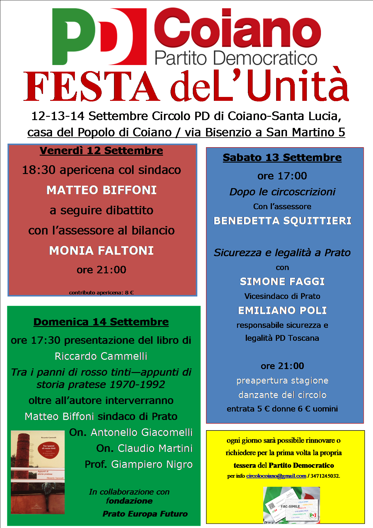 Dal 12 al 14 settembre la Festa dell’Unità di Coiano.