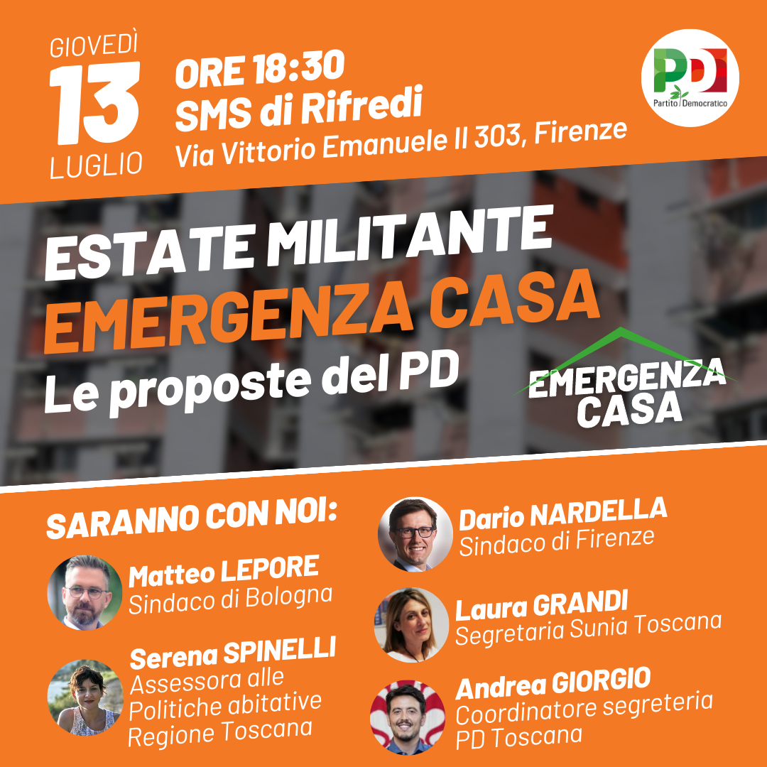Se ne parla domani, giovedì 13 luglio, alle 18:30, all’SMS di Rifredi di Firenze, insieme al Sindaco Dario Nardella, al collega di Bologna Matteo Lepore, all’assessora regionale al sociale Serena Spinelli, alla segretaria regionale del Sunia Laura Grandi e al coordinatore della segreteria regionale del PD Andrea Giorgio.