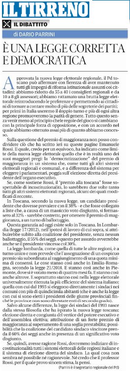 15 settembre 2014 – “Approvata la nuova legge elettorale regionale, il Pd toscano può affermare con fierezza di aver mantenuto tutti gli impegni di riforma istituzionale assunti coi cittadini: abbiamo ridotto da 55 a 40 i consiglieri regionali e da 10 a 8 gli assessori; abbiamo rottamato una brutta legge elettorale reintroducendo le preferenze e permettendo ai cittadini di tornare a contare molto di più delle segreterie dei partiti; per primi in Italia useremo il doppio turno e più di ogni altra regione promuoveremo la parità di genere. Tutto questo senza venir meno al principio che le regole del gioco si cambiano con la principale forza di opposizione, e con un accordo nel quale abbiamo ottenuto assai più di quanto abbiamo concesso. Sulla questione del premio di maggioranza non posso condividere ciò che ha scritto ieri su queste pagine Emanuele Rossi. Il quale, credo per un equivoco, ha indicato come limite della nuova legge elettorale quello che è in realtà uno dei suoi maggiori pregi: la “democratizzazione” del premio di maggioranza in un sistema che, come tutti gli altri sistemi elettorali regionali e comunali, e a differenza del sistema per eleggere i parlamentari, poggia sull’elezione diretta del presidente dell’organo esecutivo. Se, come sostiene Rossi, il “premio alla toscana” fosse sospettabile di incostituzionalità, lo sarebbero due volte tanto tutti gli altri sistemi elettorali regionali, alcuni dei quali modificati di recente. In Toscana, secondo la nuova legge, un candidato presidente che dovesse prevalere con il 38% – e che fosse collegato a liste che, a causa di un massiccio voto disgiunto, si fermassero al 32% – sarebbe costretto, per ottenere il premio di maggioranza, a un turno di ballottaggio. Questa garanzia ad oggi esiste solo in Toscana. In Lombardia (legge 17/2012), nell’ipotesi di lavoro di cui sopra, si attribuirebbe subito alla coalizione del presidente, senza nessun ballottaggio, il 55% dei seggi, e questo per assurdo avverrebbe anche se il presidente vincesse col 30%. La legge lombarda, come quella di tutte le altre regioni, è a turno unico e non prevede che l’assegnazione di un cospicuo premio sia subordinata al raggiungimento di una quota minima di consensi. Le cose stanno così anche in Emilia-Romagna, secondo la legge 21/2014. E stanno così anche in Piemonte, dove si è votato meno di quattro mesi fa. E stanno così anche altrove. E soprattutto stanno così nella legge elettorale universalmente ritenuta la più efficiente del sistema italiano: quella con cui dal 1993 si eleggono direttamente i sindaci nei comuni con più di quindicimila abitanti (che è anche la legge con cui si sono eletti i presidenti delle giunte provinciali finché le province non sono diventate enti di secondo grado). Salvo alcune differenze, la legge dei sindaci del 1993 nasce dalla stessa filosofia che ha ispirato la nuova legge toscana: elezione diretta e congiunta del vertice del potere esecutivo e dell’assemblea elettiva; attribuzione di un forte premio di maggioranza al superamento di una soglia prestabilita; possibilità che la coalizione del candidato sindaco vincitore prenda il 60% dei seggi anche in presenza di un significativo voto disgiunto. Se, quindi, avesse ragione Rossi, dovremmo indiziare di incostituzionalità tutti i sistemi elettorali delle regioni italiane e il sistema di elezione diretta del sindaco. La qual cosa non sembra né possibile né ragionevole. Né credo che il professor Rossi, per il quale provo sincera stima, la pensi”