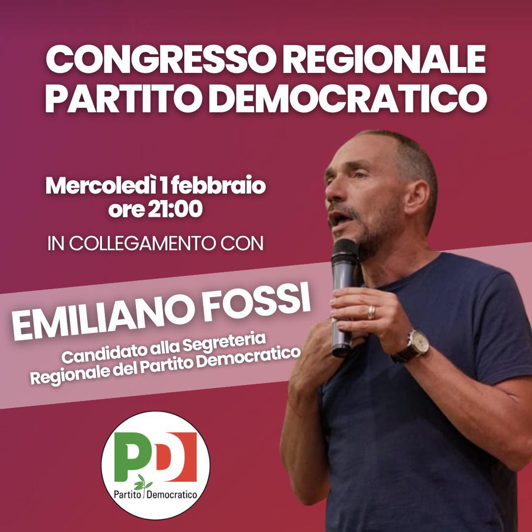 Mercoledì 1° febbraio alle ore 21.00, il candidato alla segreteria regionale del Partito Democratico Emiliano Fossi si collegherà con le iscritte e gli iscritti, le elettrici e gli elettori della Provincia di Siena per presentare il suo programma.
