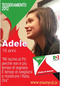 La campagna di tesseramento 2012 del Partito democratico propone dei manifesti con template tricolore, in alto a destra il primo piano di un iscritto, sorridente, che guarda davanti a sé; a sinistra nell’area rossa di trova una piccola dichiarazione sul partito e le proprie aspettative.