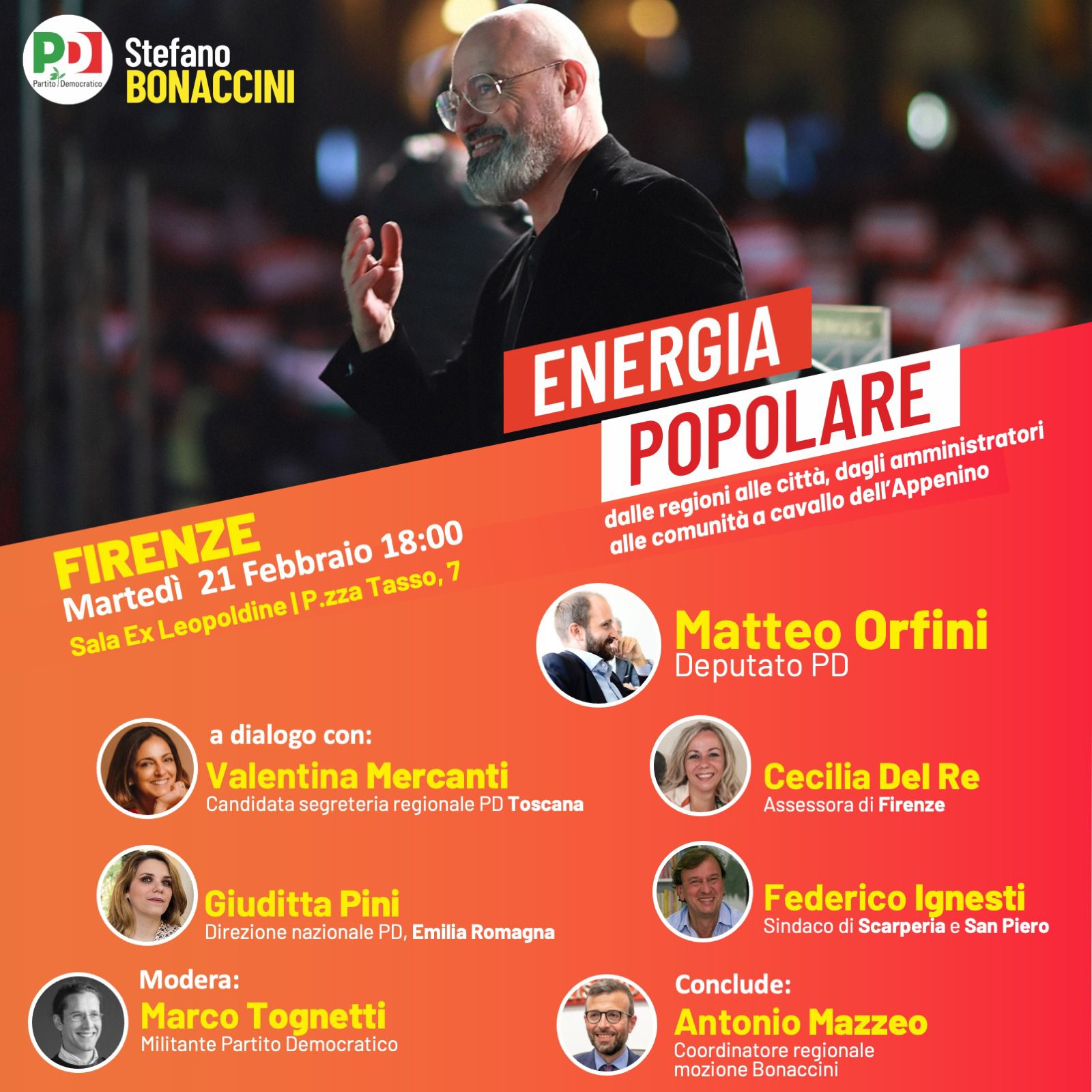 “Energia Popolare: dalle regioni alle città, dagli amministratori alle comunità a cavallo dell’Appennino“, è questo il titolo dell’incontro di martedì 21 febbraio alle 18, alla sala Ex Leopoldine di Firenze. Parteciperanno Valentina Mercanti, Matteo Orfini, Cecilia Del Re, Giuditta Pini e Federico Ignesti. Modera Marco Tognatti e conclude Antonio Mazzeo.