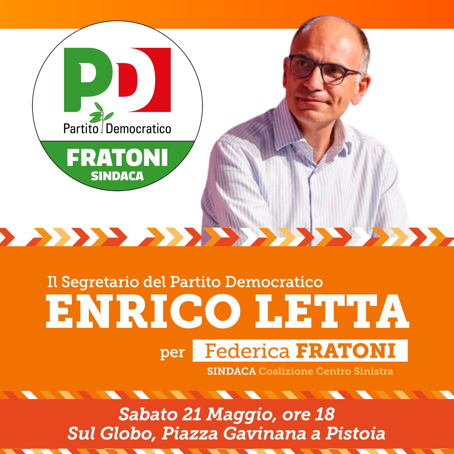 Sabato 21 maggio alle 18, sul Globo in piazza Gavinana a Pistoia, sarà presente il segretario del Partito Democratico Enrico Letta per sostenere la candidata sindaca Federica Fratoni.