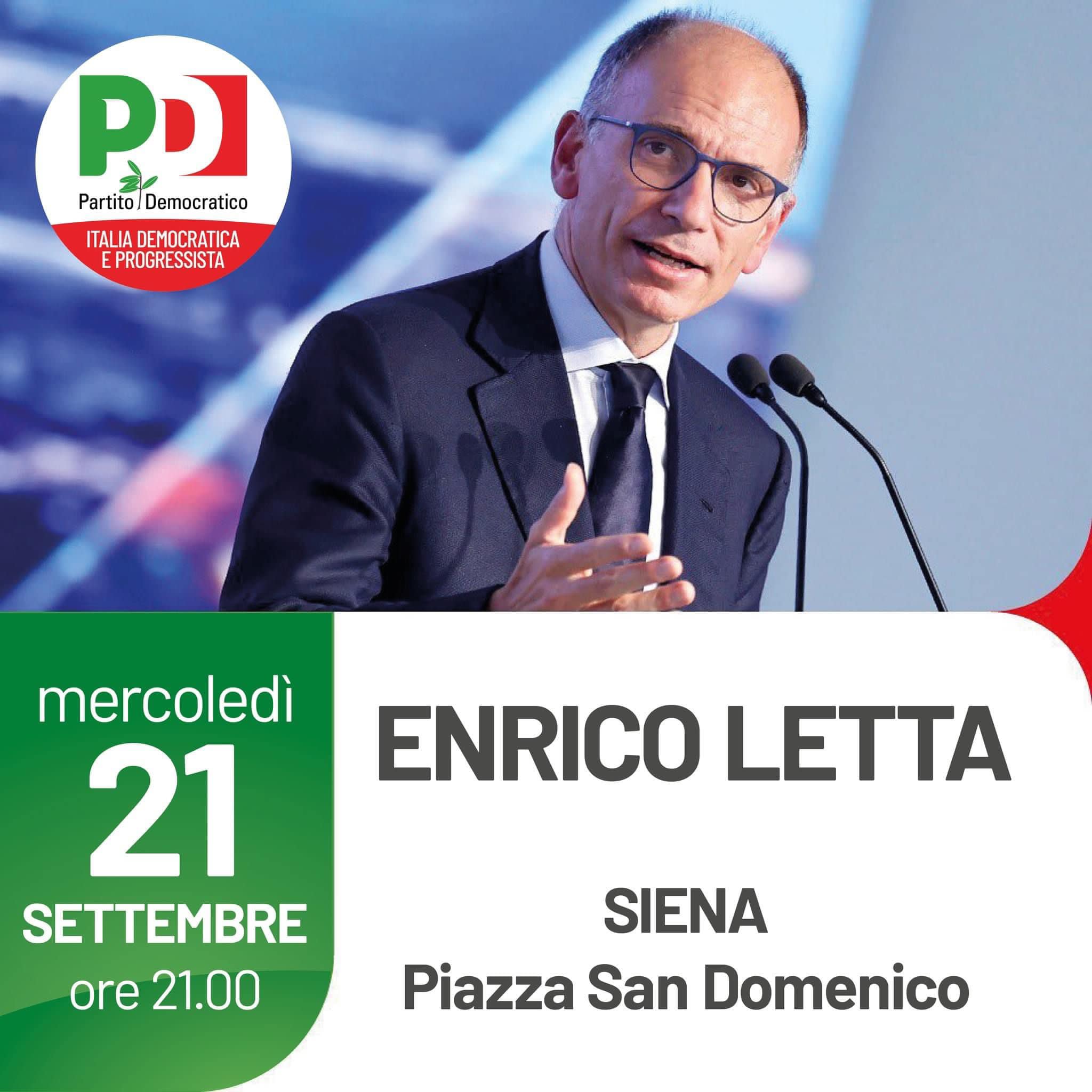 Il segretario del Partito Democratico, Enrico Letta, sarà a Siena mercoledì 21 settembre alle 21:00, in piazza San Domenico.