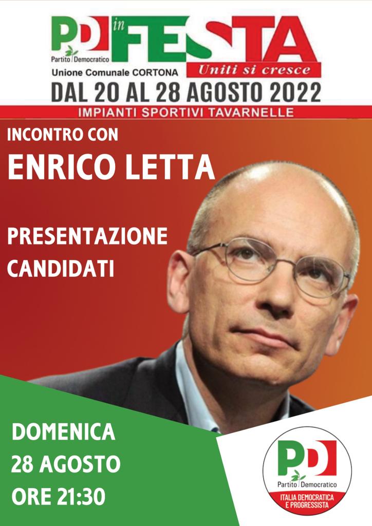 Enrico Letta accompagnerà la presentazione dei candidati nel collegio di Arezzo alla Festa dell’Unità di Cortona domenica 28 agosto alle 21:30, presso gli impianti sportivi di Tavarnelle.
