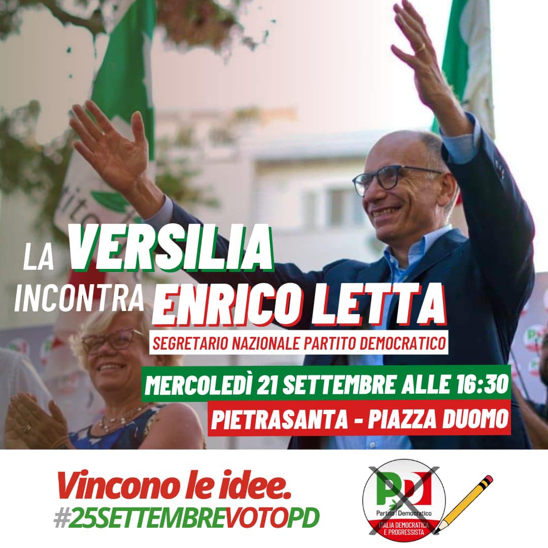 Il segretario del Partito Democratico, Enrico Letta, viene in Versilia mercoledì 21 settembre alle 16:30, in piazza Duomo a Pietrasanta.