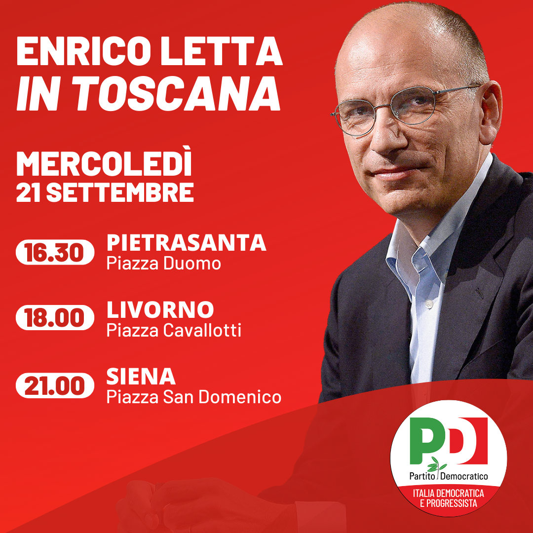 Il segretario del Partito Democratico Enrico Letta, mercoledì 21 settembre, fa tappa in tre province della Toscana.