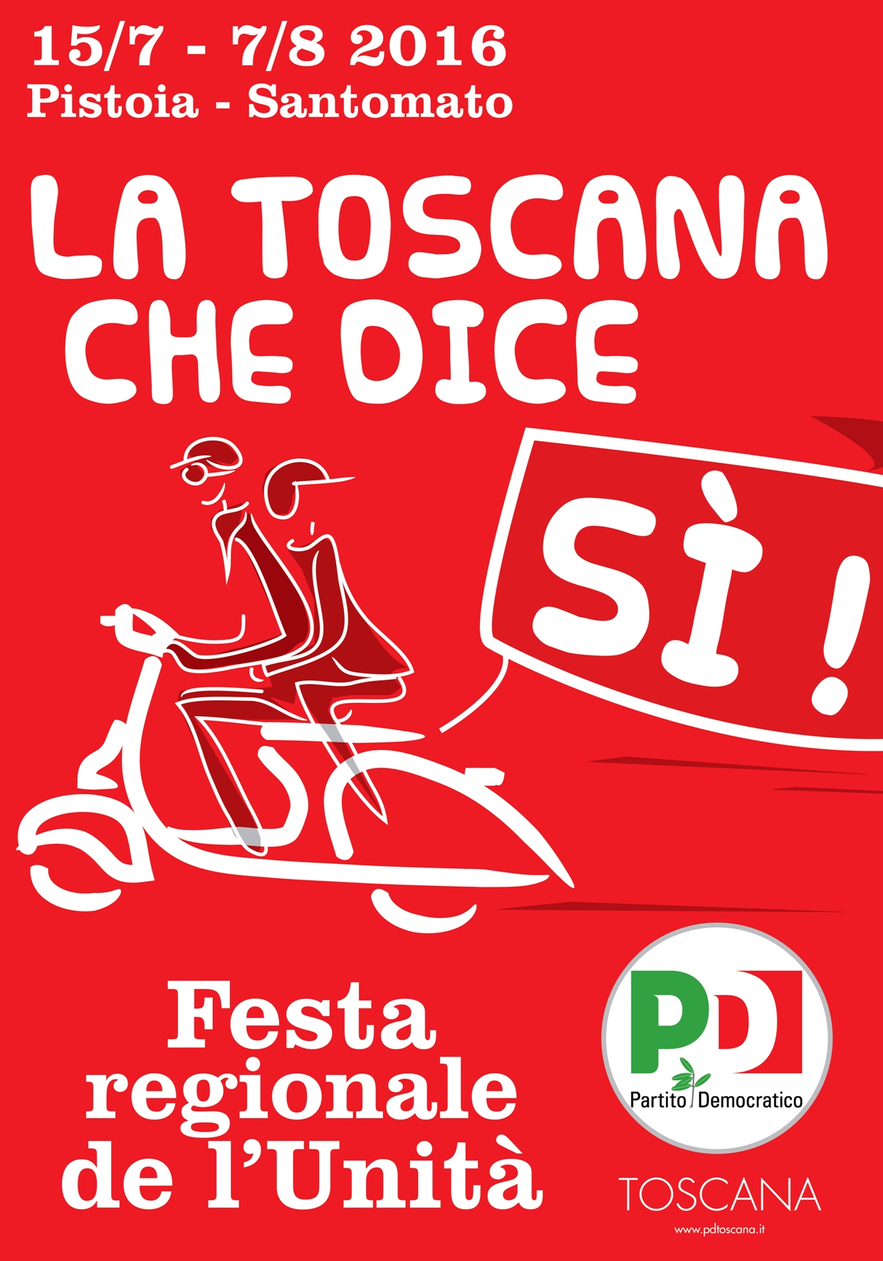 Sarà Pistoia quest’anno ad ospitare la Festa regionale dell’Unità toscana. Dal 15 luglio al 7 agosto, ministri, sottosegretari, parlamentari, dirigenti, giunta regionale e amministratori locali saliranno sul palco della festa che si tiene in località Santomato e che sarà dedicata soprattutto ai temi del referendum costituzionale – a partire dal titolo “La Toscana che dice Sì” – e anche alla designazione di Pistoia a città capitale della cultura italiana 2017.