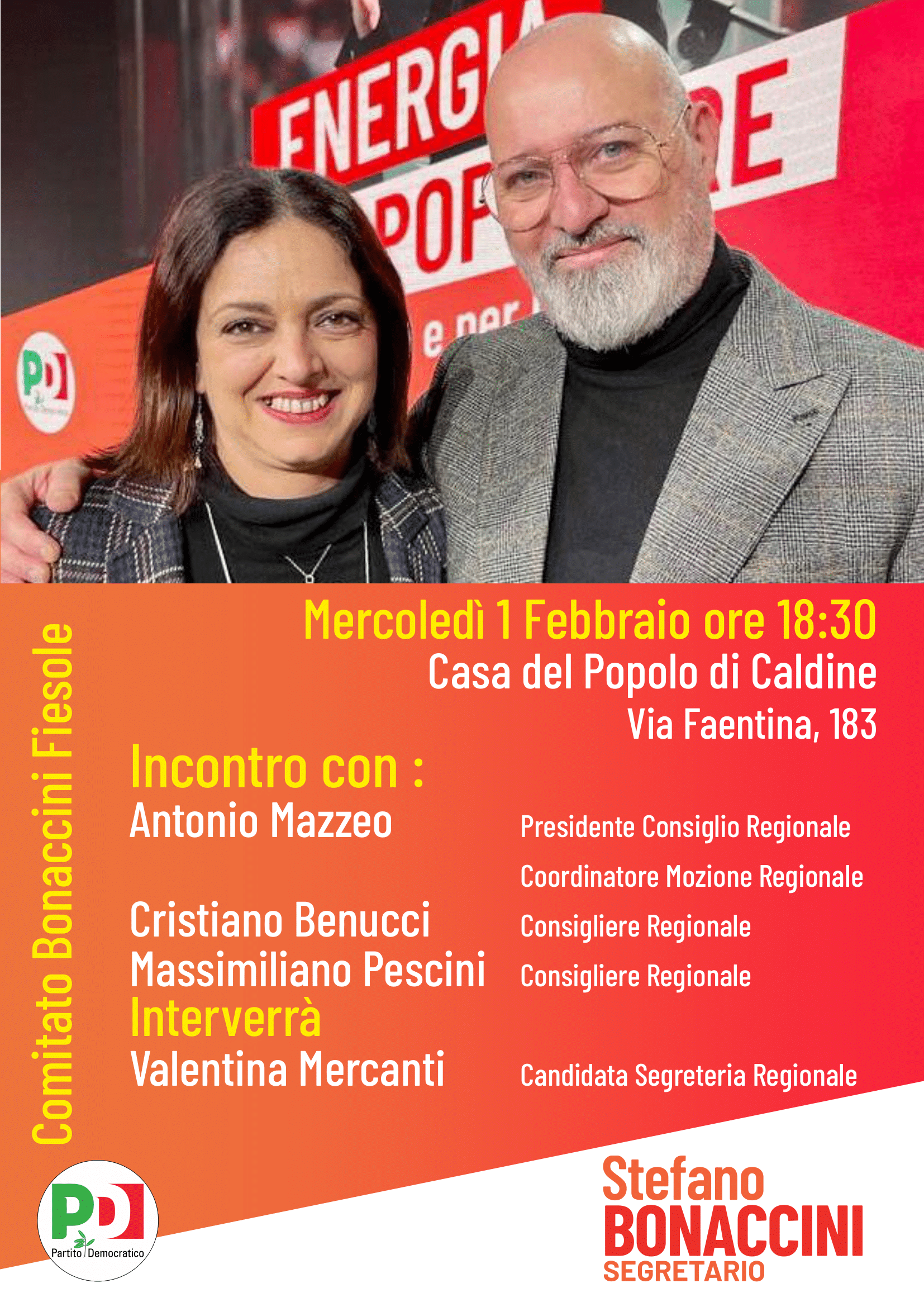 A Fiesole un incontro a sostegno delle mozioni di Stefano Bonaccini e Valentina Mercanti. Appuntamento mercoledì 1° Febbraio alle 18:30, alla Casa del Popolo di Caldine, Via Faentina 183.
