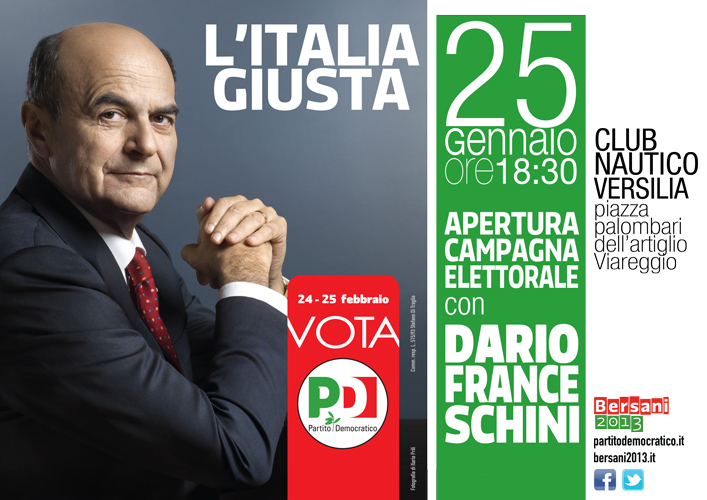 Venerdì 25 gennaio il capogruppo del Pd alla Camera Dario Franceschini sarà a Viareggio per aprire ufficialmente la campagna elettorale in vista delle prossime elezioni politiche del 24 e del 25 febbraio.
