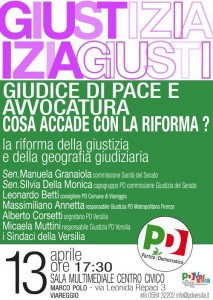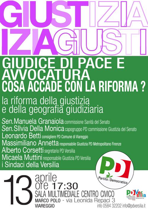 L’incontro, organizzato dal forum Giustizia del Pd toscano e dal Pd della Versilia, rientra nel ciclo di iniziative sulla riforma della giustizia e in particolare delle circoscrizioni giudiziarie e dell’avvocatura. Parteciperanno le senatrici Manuela Granaiola (membro della commissione Sanità) e Silvia Della Monica (capogruppo Pd in commissione Giustizia), il consigliere comunale del Pd a Viareggio Leonardo Betti, il responsabile del forum Giustizia del Pd metropolitano di Firenze Massimiliano Annetta, il segretario e la responsabile Giustizia del Pd di Viareggio Alberto Corsetti e Micaela Muttini, i sindaci della Versilia.