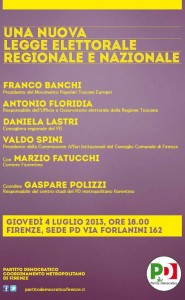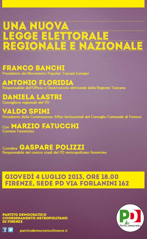 Gioved ì 4 luglio 2013, ore 18.00 FIRENZE, Sede Pd Via Forlanini 162, “Una nuova legge elettorale regionale e nazionale”. Parteciperanno Franco Banchi, Presidente del Movimento Popolari Toscani Europei, Antonio Floridia, Responsabile dell’Ufficio e Osservatorio elettorale della Regione Toscana, Daniela Lastri, Consigliera regionale del PD, Valdo Spini, Presidente della Commissione Affari Istituzionali del Consiglio Comunale di Firenze, Marzio Fatucchi, Corriere Fiorentino. Coordina Gaspare Polizzi, Responsabile del centro studi del PD metropolitano fiorentino
