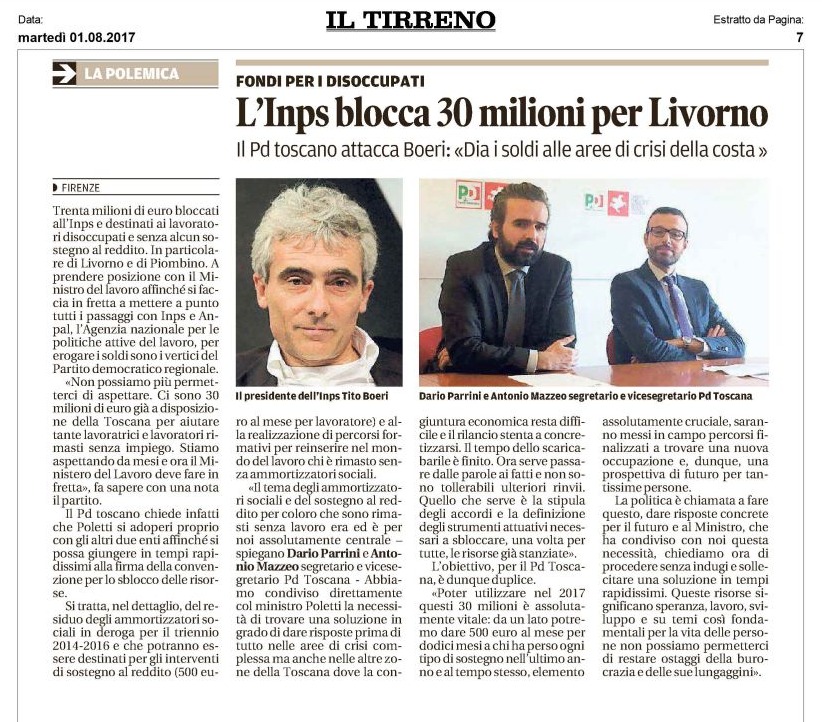 Il Pd toscano attacca Boeri ” Dia i soldi alle aree di crisi della costa”