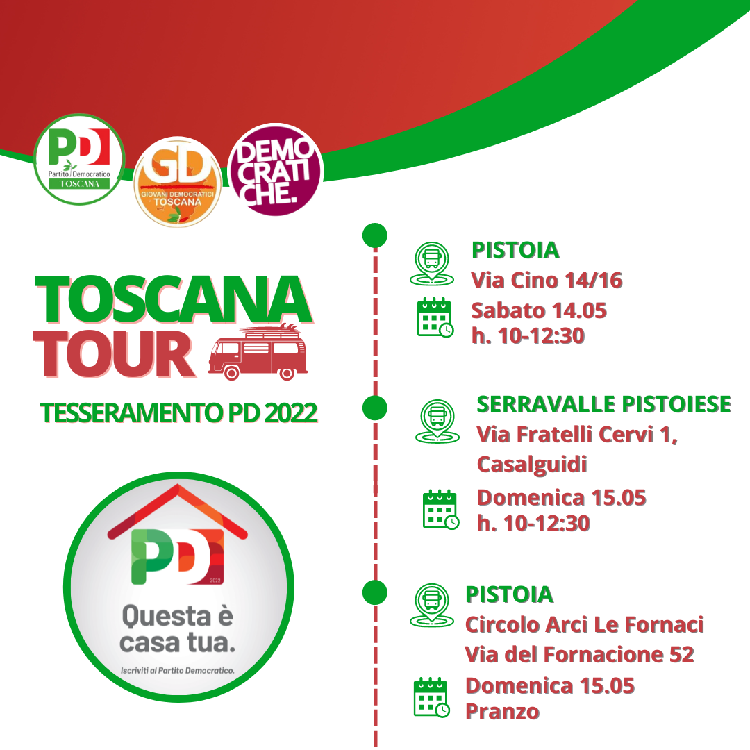 Domani dalle 10 alle 12:30 verrà allestito un banchino in via Cino 14, a Pistoia. Domenica 15 maggio, sempre dalle 10 alle 12:30, il tour farà tappa a Casalguidi, frazione del comune di Serravalle Pistoiese di fronte al Circolo Arci Milleluci. Terminato l’incontro, il furgoncino tornerà a Pistoia per il pranzo organizzato dai Giovani dem di Pistoia al Circolo ARCI Le Fornaci.