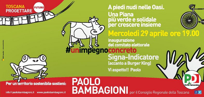 Inaugurazione ufficiale del comitato del consigliere regionale nel collegio Firenze ovest Paolo Bambagioni Mercoledì 29 aprile (ore 19) a Signa (zona Indicatore – dietro Burger King)