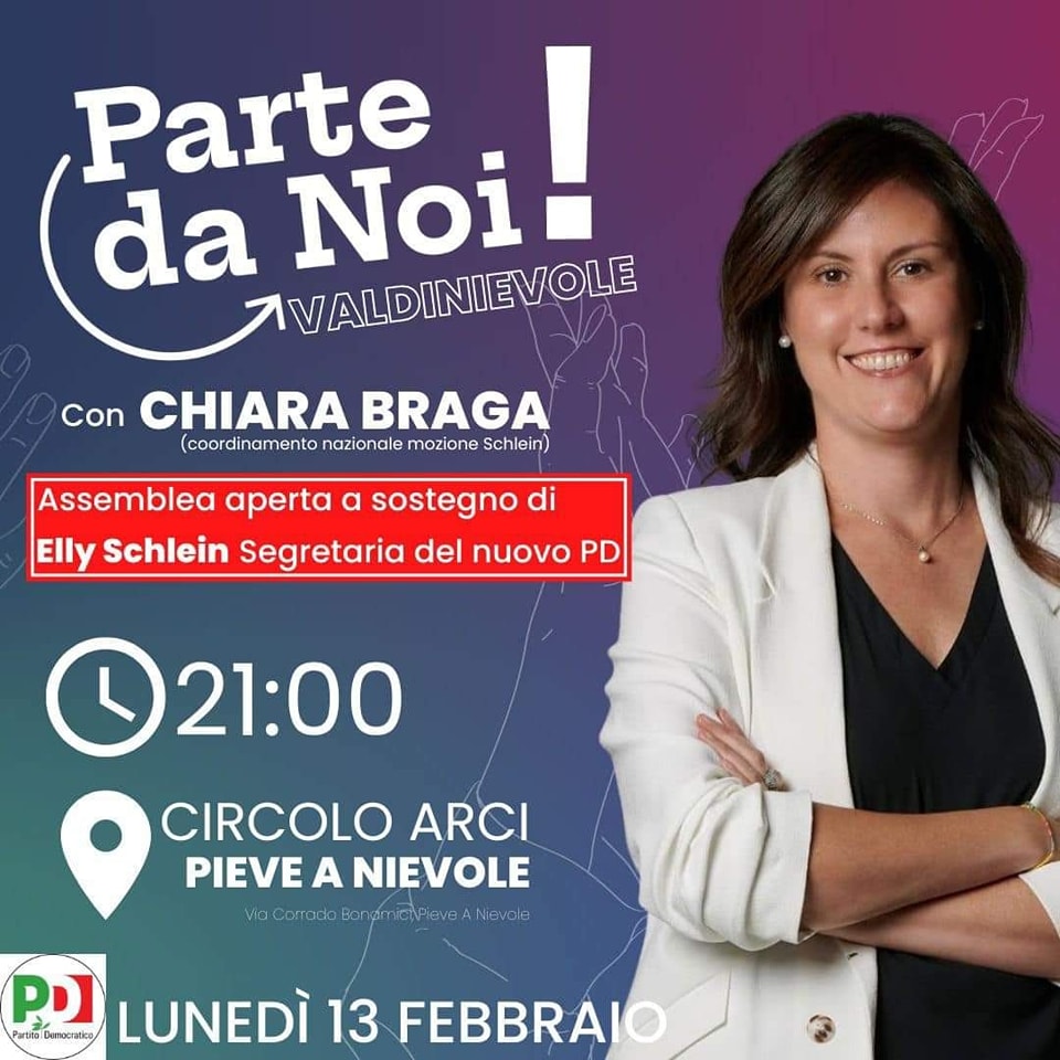 Lunedi 13 febbraio alle ore 21:00, la coordinatrice nazionale delle iniziative di Elly Schlein Chiara Braga sarà a Pieve a Nievole.