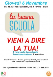 Giovedì 6 novembre alle ore 18,00 a Signa presso il circolo Donizetti il Pd ed i Gd di Signa organizzano i tavoli di discussione su “La Buona Scuola”; un’occasione per confrontarsi sui 12 punti proposti dal Governo Renzi e così sintetizzabili: