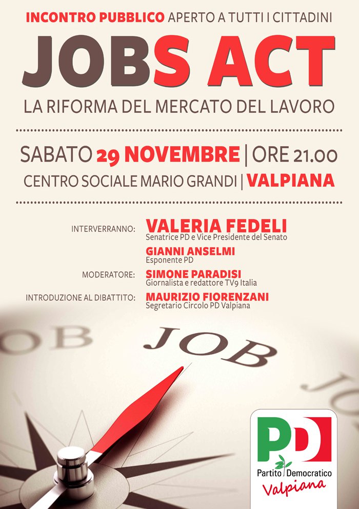 Sabato 29 novembre ore 21, iniziativa sul Jobs Act a Valpiana (Massa Marittima) con il vice presidente del Senato Valeria Fedeli, Gianni Anselmi, Simone Paradisi e Maurizio Fiorenzani