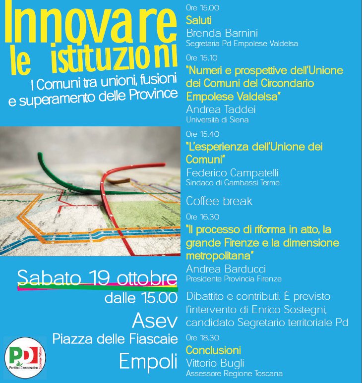 “Innovare le istituzioni: i comuni tra unioni, fusioni e superamento delle province” è questo il titolo del seminario organizzato dal Partito democratico Empolese Valdelsa che si terrà sabato 19 ottobre alle 15.00 presso l’Agenzia per lo sviluppo dell’Empolese Valdelsa.