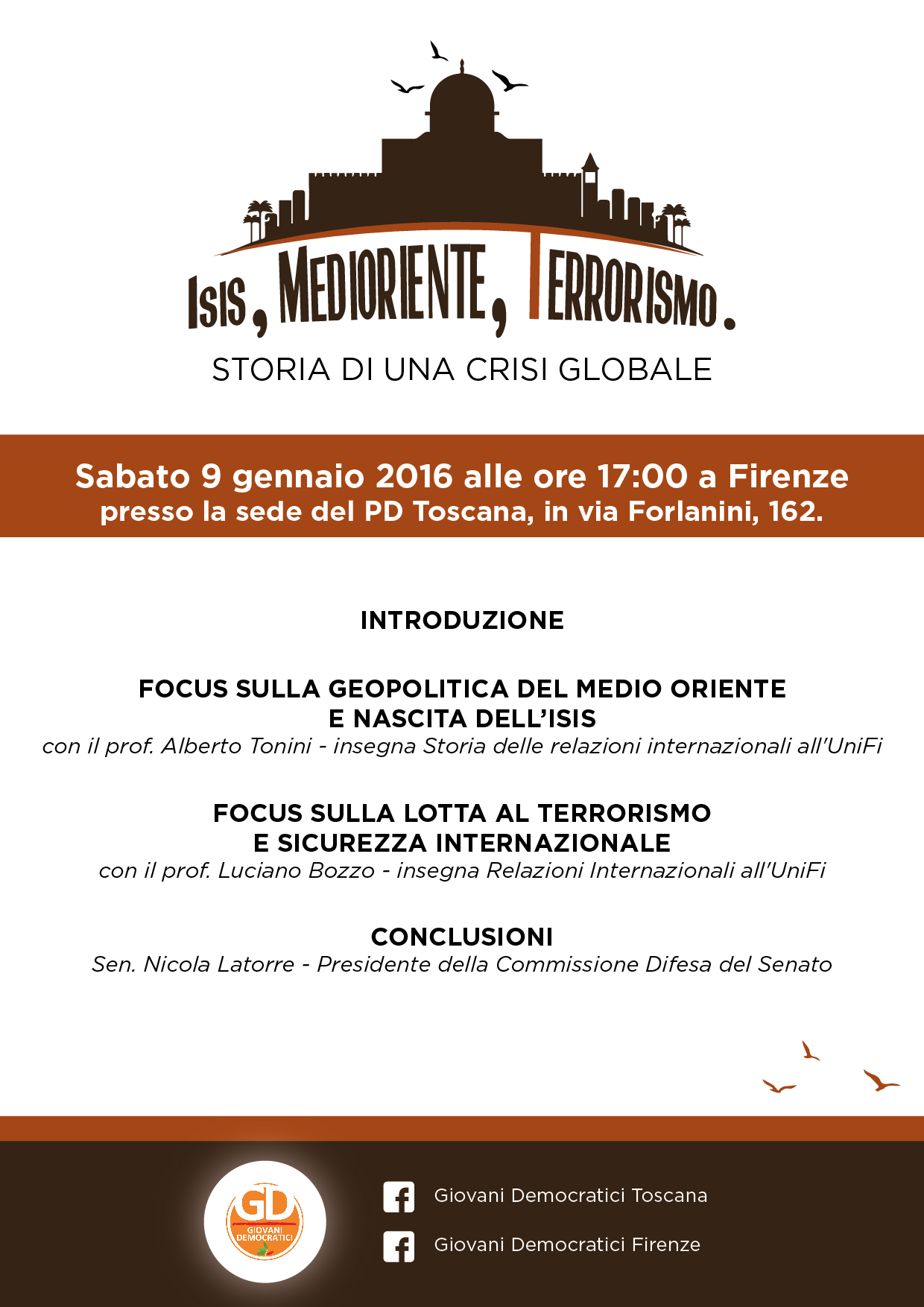 Alla luce dei fatti che hanno sconvolto l’Europa dopo gli attacchi di Parigi dello scorso 13 novembre, come Giovani Democratici della Toscana abbiamo pensato di organizzare un’iniziativa sui temi della sicurezza internazionale,