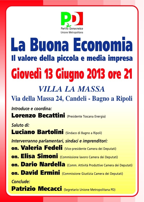 Il 13 giugno 2013 alle ore 21 il PARTITO DEMOCRATICO Coordinamento Metropolitano di Firenze organizza l’iniziativa “LA BUONA ECONOMIA – Il valore della piccola e media impresa”. Lincontro si terrà a VILLA LA MASSA, Via della Massa 24 Candeli – Bagno a Ripoli (Firenze) e sarà introdotto e coordinato da LORENZO BECATTINI ( Presidente Toscana Energia ), saluto di LUCIANO BARTOLINI ( Sindaco di Bagno a Ripoli ), interverranno parlamentari, sindaci e imprenditori: Sen. VALERIA FEDELI (Vice – Presidente Senato), On. ELISA SIMONI ( Commissione lavoro Camera dei Deputati ), On. DARIO NARDELLA ( Commissione Attività Produttive Camera dei Deputati ), On. DAVID ERMINI ( Commissione Giustizia Camera dei Deputati ), Conclude PATRIZIO MECACCI ( Segretario Metropolitano Pd Firenze )