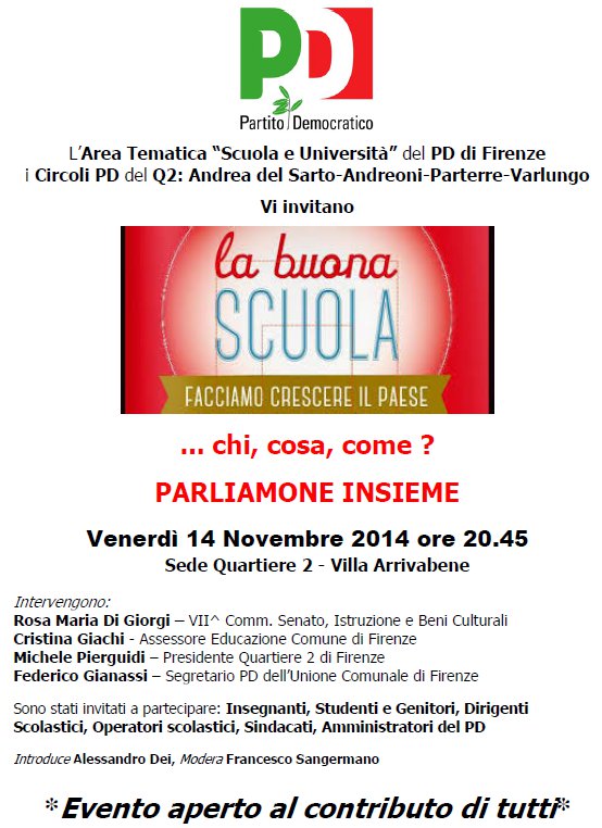 L’Area Tematica “Scuola e Università” del PD di Firenze, i Circoli PD del Q2: Andrea del Sarto-Andreoni-Parterre-Varlungo, Vi invitano a