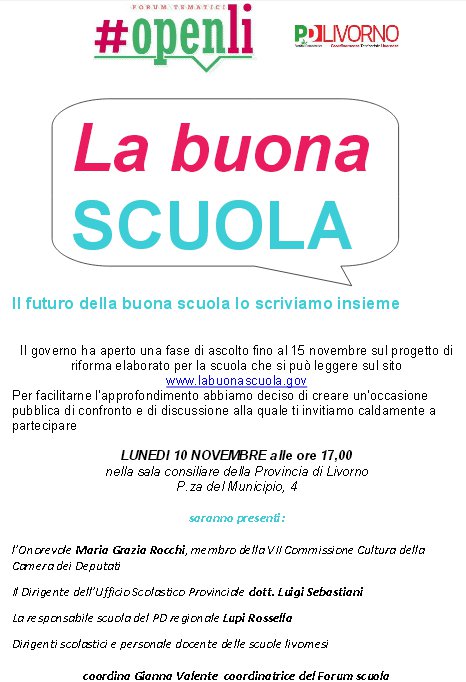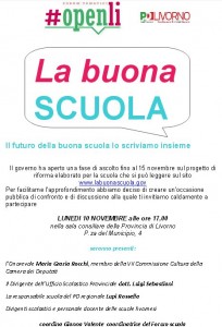“La buona scuola. Il futuro della buona scuola lo scriviamo insieme” è il titolo dell’incontro pubblico previsto per lunedì 10 novembre alle ore 17 nella sala consiliare della Provincia di Livorno (Piazza del Municipio 4).