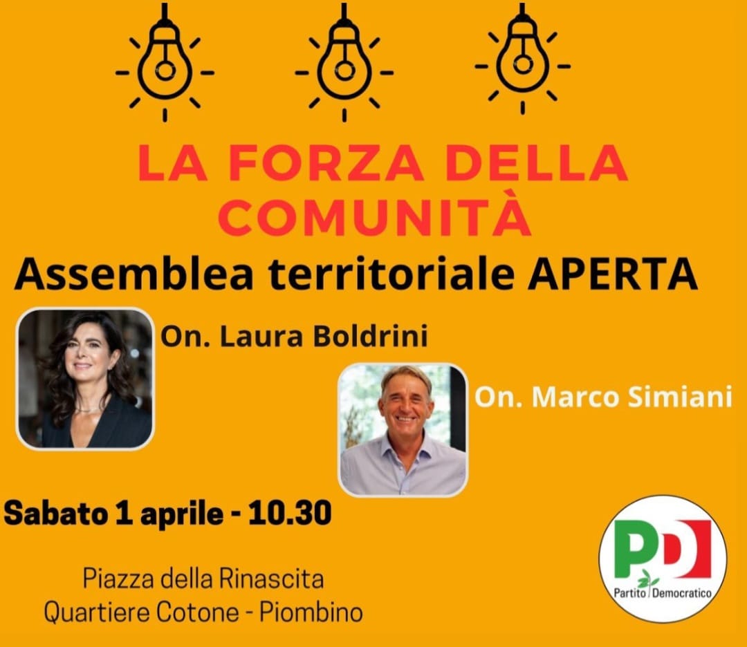 Sabato 1° aprile, alle 10.30, assemblea territoriale aperta a Piombino dal titolo “La forza della comunità” con gli onorevoli Laura Boldrini e Marco Simiani. Appuntamento in piazza della Rinascita, al Quartiere Cotone.