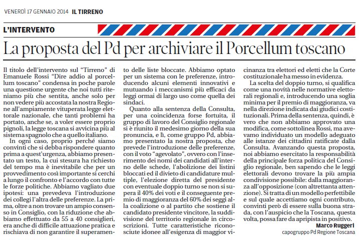 Intervento di Marco Ruggeri, Capogruppo Pd in Consiglio regionale, su Il Tirreno del 17 gennaio 2014.