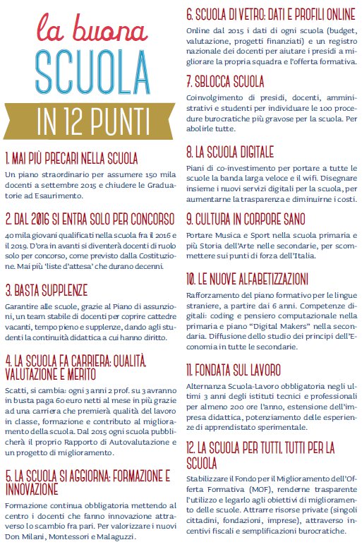 14 ottobre 2014 – ‘Vi propongo un patto, un patto educativo. Noi sul tavolo mettiamo le idee che vedete e tutto il coraggio che abbiamo, per evitare il coro di lamentela dei rassegnati e dei cinici che già dicono: “Tanto non cambia mai nulla”. A voi chiedo di essere protagonisti e non spettatori. Chi vuole bene all’Italia vuole bene alla scuola. Renderla più giusta e più rispettata è il nostro obiettivo. Lo facciamo insieme?’