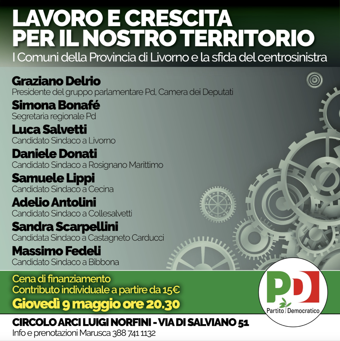 Giovedì 9 maggio, ore 20.30 al Circolo Arci Luigi Norfini (Via di Salviano 51, Livorno) i candidati a Sindaco della provincia di Livorno si riuniranno per un incontro pubblico e una cena di finanziamento con Graziano Delrio, Capogruppo PD alla Camera dei Deputati e Simona Bonafé, Segretaria regionale e candidata del PD alle europee.
