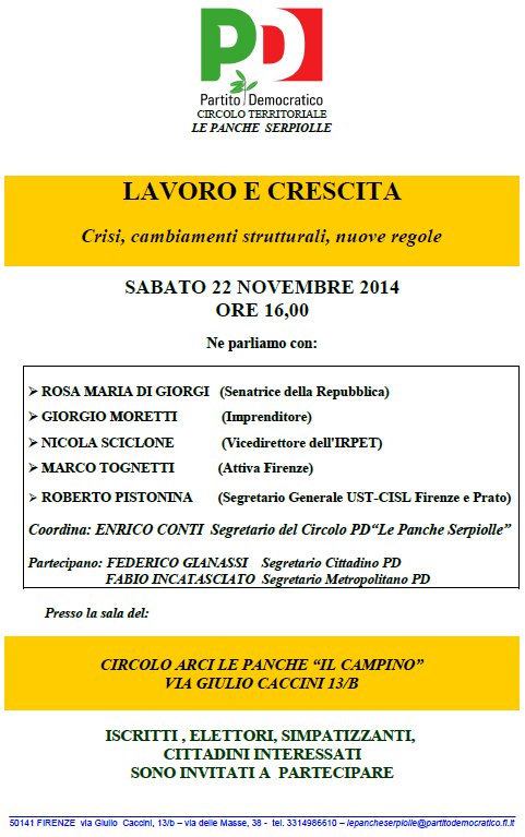 “Lavoro e crescita”, se ne parla sabato al circolo Le Panche Serpiolle di Firenze