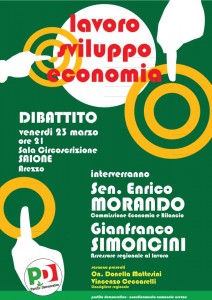 Il Partito Democratico di Arezzo, promotore e organizzatore del dibattito, si confronta rispetto a temi importanti su cui l’attenzione politica è centrale e di grande rilevanza. A parlare il senatore Enrico Morando, membro della quinta commissione Bilancio e Programmazione economica del Senato che illustrerà i provvedimenti governativi e il dibattito sui temi caldi riguardanti la questione occupazionale nel Paese.